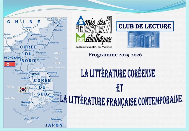 Cette année 2025-2026 le club de lecture part à la découverte de la littérature Coréenne contemporaine d’octobre à mars puis de la littérature Française contemporaine d’avril à juin.
