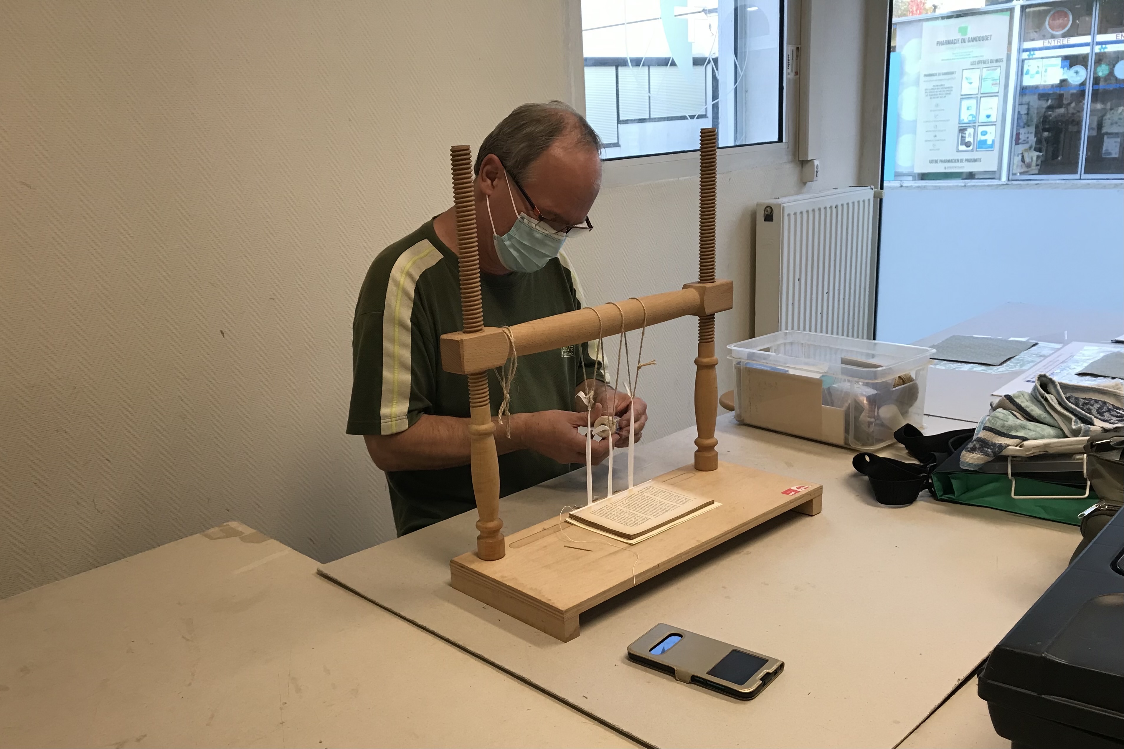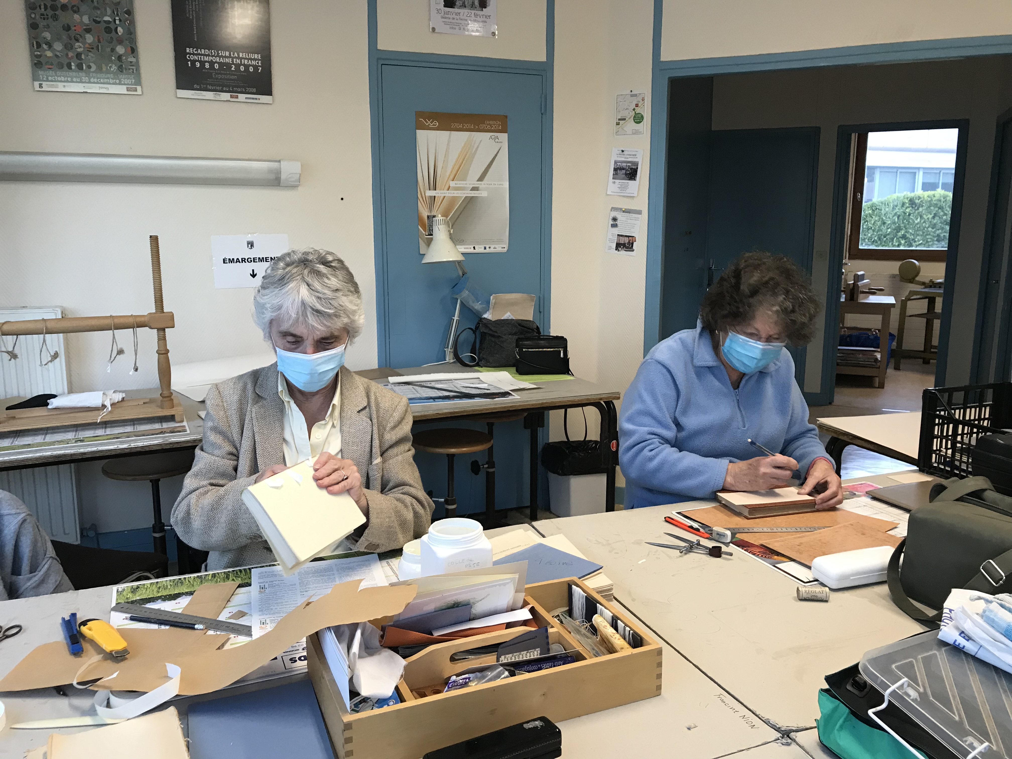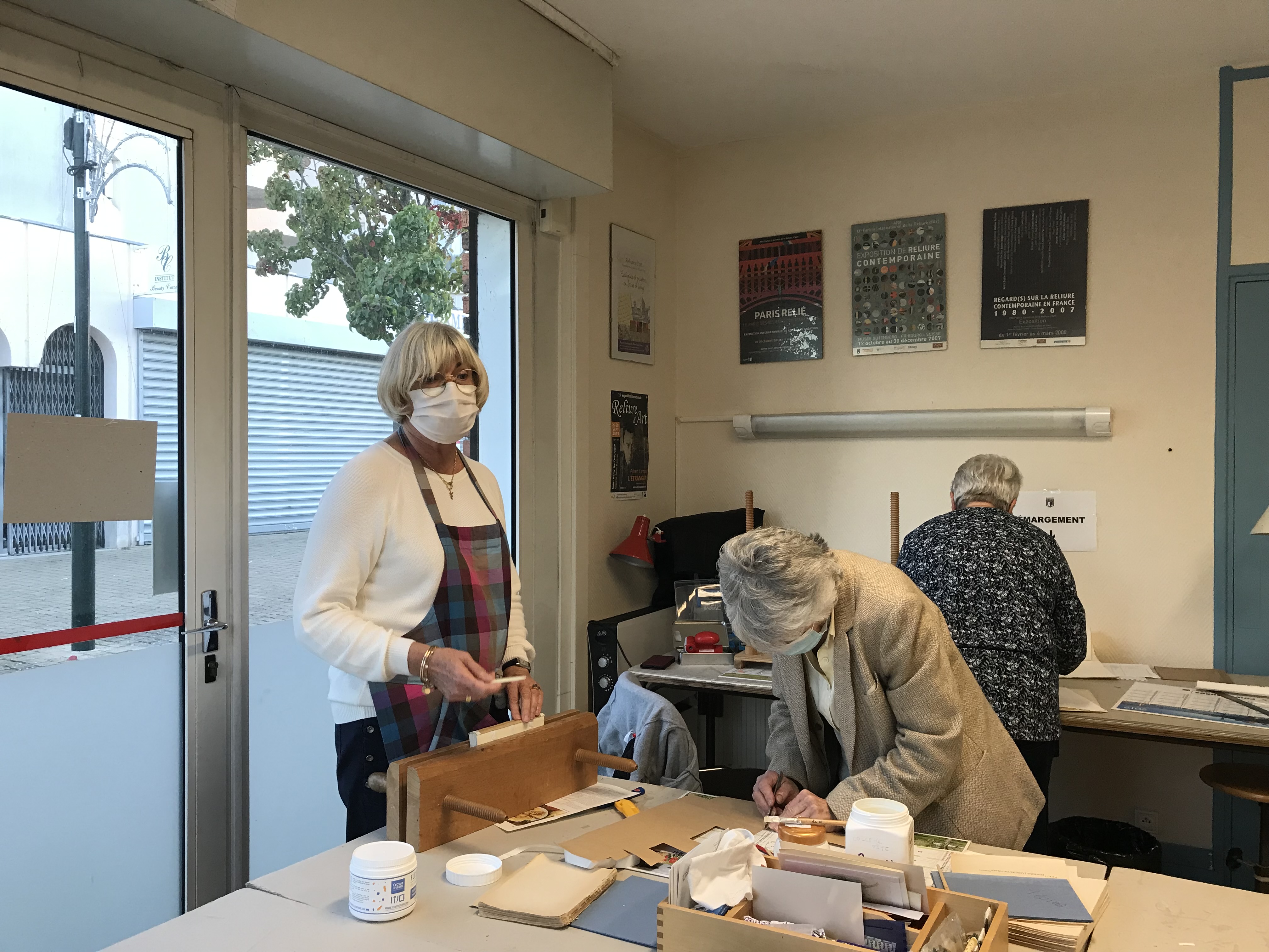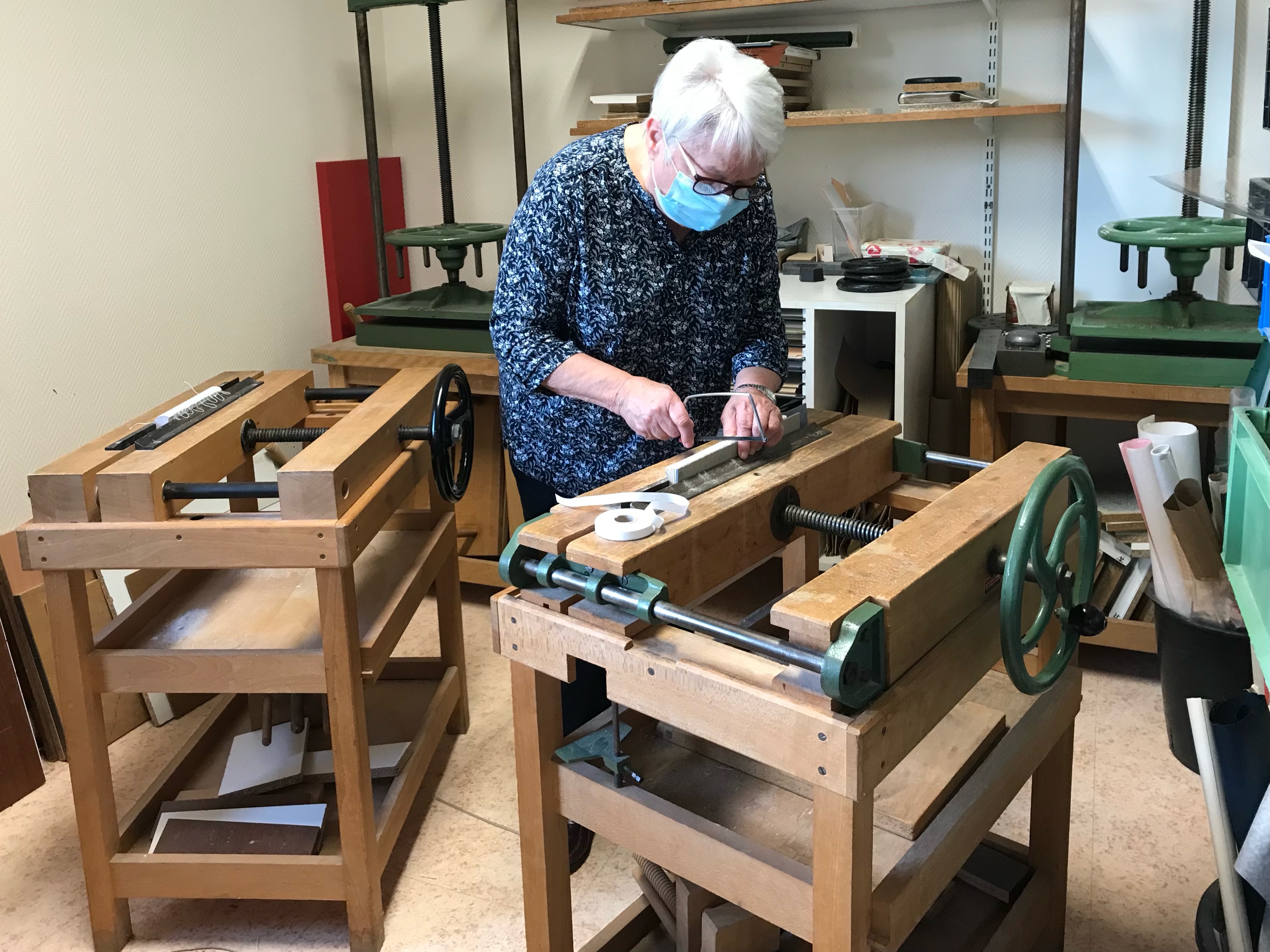 Témoignage : « L’animatrice s’occupe prioritairement des nouveaux. Il faut arriver avec un livre quel que soit son état. On commence par le restaurer s’il est en mauvais état. S’il est en bon état on passe directement à la reliure. Notre créativité est sollicitée, on peut faire des reliefs (reliure cuir), coller des éléments sur papier. On enrichit le support de la couverture. Cette activité est très stimulante dès le début. On apprend à être minutieux. On utilise des outils performants disponibles dans l’atelier. »